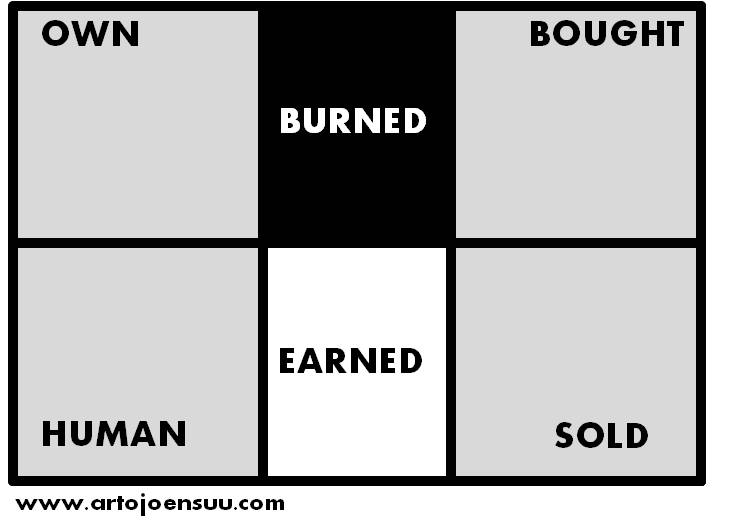 @Jussi, thanks for the comments. I like your thinking about including the organizational elements to this thread. The forementioned angle describes the setup of an organization that is needed to achieve specific tasks in a given moment. Your decisions about using OBE media has big organizational implications that many brands fail to recognize. As mentioned earlier, social media requires more time than money. Brands need to start seeing this distinction between time and money in order to succeed in this space and often it means also fundamentally changing structures of entire organizations. Less money is put on paid media and more on human media to manage communities as well as optimize the existing own media properties. However, i’m not sure if i would regard organizational as a media per se, thus still dropping it out from the actual list. Your media strategy should have implications to your organizational elements/structure/governance and especially social media related activities should have several stakeholders involved, again, depending on the strategic objectives of the company (for ex care, comms, marketing, hr etc)