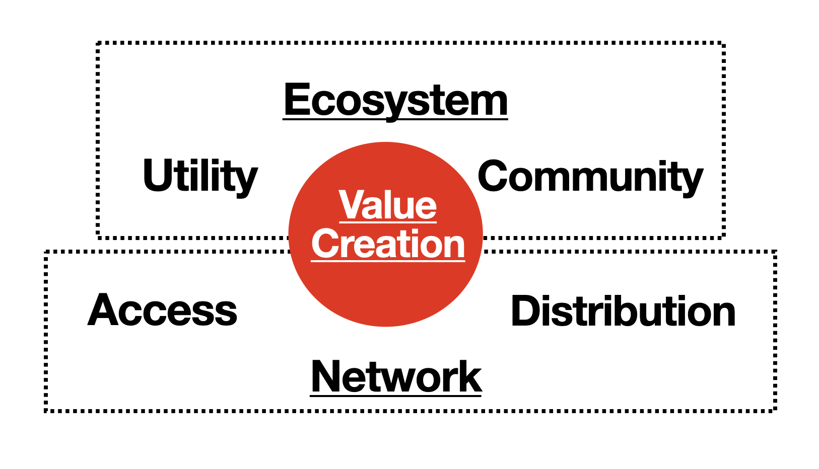 A network with access and distribution can then serve as a birthplace for an ecosystem. In a similar manner, the pillars of a vibrant ecosystem rely on the access and distribution of a network but start to evolve around founding pillars of its own: utility and community. In other words, a vibrant ecosystem serves the social practices of its members through value creation. An invention is the spark but innovation evolves from how this invention is used to co-create value.
